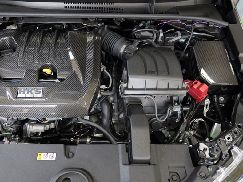 • Esta es una pieza personalizada para usar sobre la caja de fusibles original. El mismo material de carbono tejido de sarga se utiliza como cubierta del motor para darle consistencia. El logotipo de HKS está impreso en la superficie.